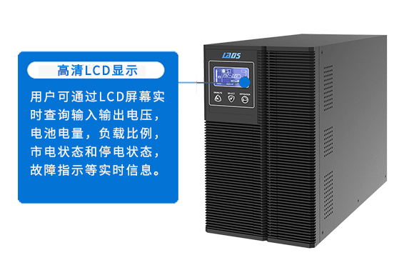 用戶可通過LCD屏幕實(shí)時(shí)查詢輸入輸出電壓,電池電量,負(fù)載比例,市電狀態(tài)和停電狀態(tài),故障指示等實(shí)時(shí)信息。