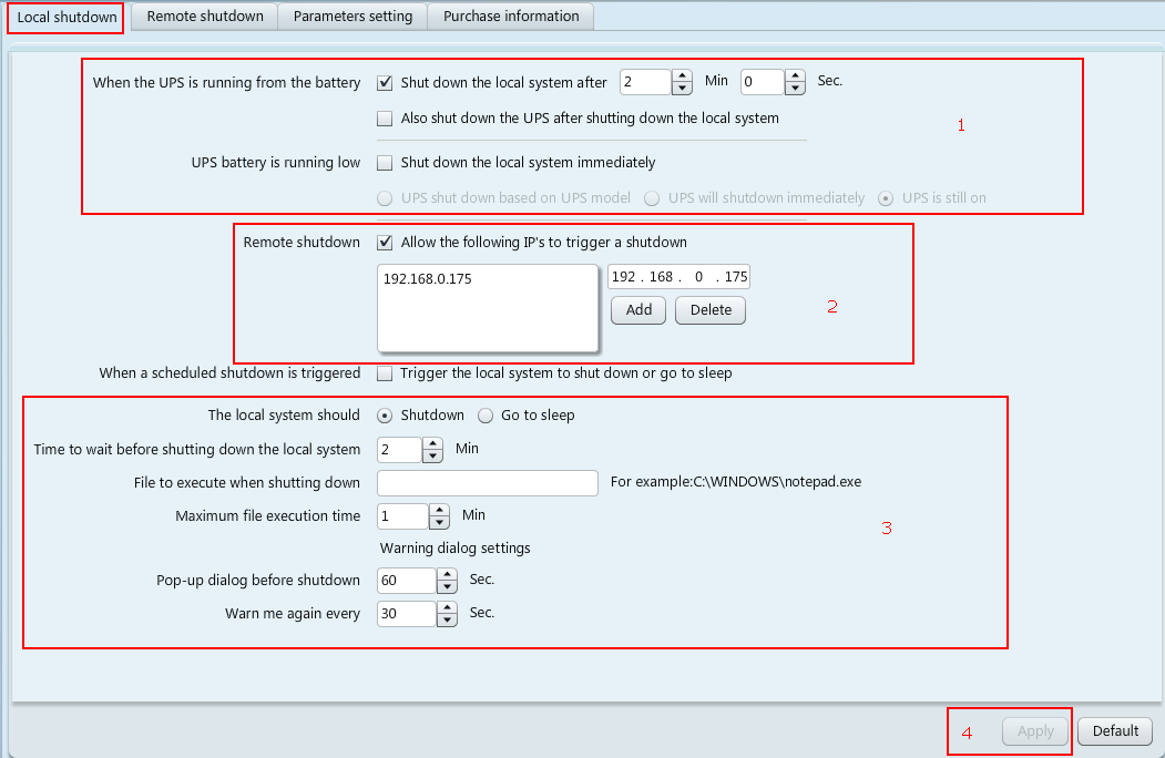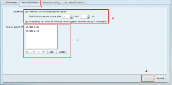 5. 交流電源關(guān)閉后,關(guān)機(jī)命令從192.168.0.175發(fā)送到192.168.0.180和192.168.1.168,然后自動關(guān)機(jī),最后UPS關(guān)機(jī)。